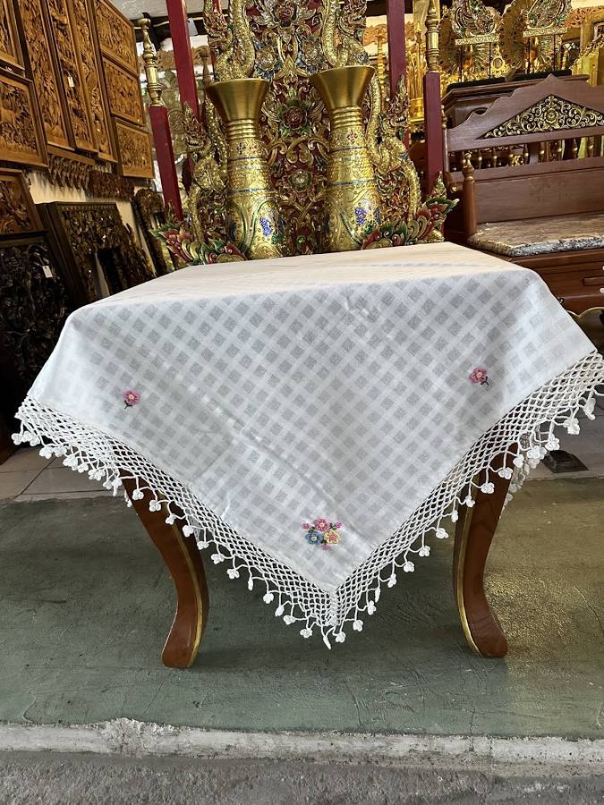 ผ้าคลุมโต๊ะเคียง ผ้าคลุมโต๊ะ ผ้าปูโต๊ะ ขนาดมาตรฐาน 2ขนาด ผ้าฝ้ายปักตัวหนอน ถักริมโคเชต์ สีขาว